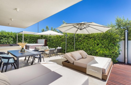 This holiday home is perfect for a holiday with friends or family and impresses with its modern design and carefully selected details, which you will find in every corner. You will be particularly impressed by the outdoor area. On the first floor you will find a large sun deck. Here you can spend many hours on one of the sun loungers. The terrace has a relaxation area and a dining area. Here you can enjoy breakfast together or round off the day with a glass of wine. There is also a barbecue for cosy barbecue evenings. The pool has an electrolysis system and also offers you a pleasant massage as it has built-in jets. You will spend many pleasant hours in and around your pool. Seek additional relaxation on the beautiful sun loungers by the pool as well as the large bed loungers. There is also a trampoline for the little ones.