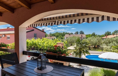 3-family house "Koštro". In the resort 400 m from the centre of Nova Vas, 5 km from the centre of Poreč, in the residential district, 5 km from the sea. For shared use: property 1'200 m2, garden with lawn and trees, swimming pool (8 x 4 m, depth 150 cm, seasonal availability: 01.May. - 01.Oct. pool opening hours: 08:00-22:00). Outdoor shower, terrace, barbecue. In the house: internet access. Parking on the premises. Shop 400 m, supermarket 5 km, restaurant 500 m, bus stop 8 km, railway station 32 km, rocky beach 5 km. Marina 5 km. Please note: the owner lives on the same property. Airfield 50 km from the property.