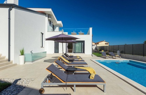 The stylish Villa Dolcea is a 4-bedroom villa in the charming village of Kastel about 8 km from the sea. The villa is perfect for those who want to relax in a peaceful atmosphere and idyllic nature. Can you imagine yourself relaxing on the cozy sun loungers next to the pool? The first floor consists of a modern decorated living room, two comfortable bedrooms with double beds and a fully equipped, spacious kitchen and dining room, both flooded with light. The other two bedrooms are located on the upper floor. You can soak up the Istrian sun not only next to the pool, but also on the charming terrace on the second floor.