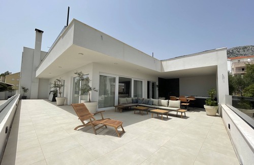 This newly built apartment has as much terrace as it does interior living space (a total of 200 m2). All bedrooms are en suite, have an A/C and are connected to the terrace. The terrace, our favourite part of the apartment, has an unbeatable view of the sea and surrounding islands and includes a hot tub, shower, lounge furniture and an exterior dining table. All of this just meters from the sea and beautiful pebble beaches with crystal clear water (if you will ever want to leave the terrace!).