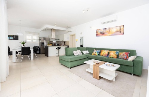 The modernly designed vacation home with pool is spread over three floors. Next to the spacious lawn there is an outdoor grill where you can prepare delicious food while your children enjoy the game. On the first floor are fitness and sauna. The house is located in a green residential area and walking distance from the coast. The beautiful pebble beach is also only 190 m from the house. The historic town of Trogir, a UNESCO World Heritage Site, is 8 km away and offers plenty of entertainment for all generations.