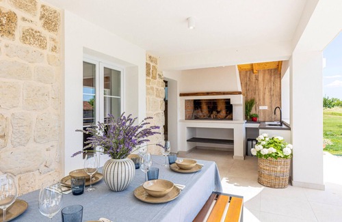 Enjoy your holiday in this beautiful holiday home in Sinj, which impresses with its peaceful location and breathtaking views of the surrounding countryside. The house offers stylish and comfortable furnishings that create a welcoming atmosphere. The interiors combine traditional brickwork with modern design and are equipped with everything you need for a relaxing stay. Explore the two floors, feel right at home and relax on the sofa by a cosy open fire