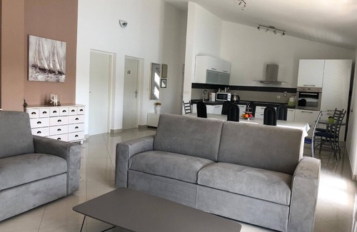 The flat is located on the 1st floor of the house near the sea, has 120m² and consists of 4 double bedrooms, a 50m² living room with kitchen and dining room, bathroom with shower and toilet, extra toilet, balcony, garden shower and much more. The flat is air-conditioned and comfortably equipped and cosily furnished: with satellite TV, internet, air conditioning, ceramic hob with 4 ceramic hotplates, oven, fridge, coffee pod machine and filter coffee machine with thermos, kettle, dishwasher, crockery and cutlery