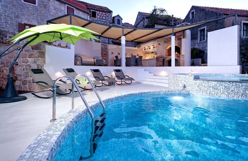 However, the secrets lie just behind the stone walls. Outside of the home, guests can enjoy a sprawling garden covering 300m2. Outdoors, guests have access to the swimming pools, outdoor kitchen, lounge and dining area. There is also an outdoor shower and separate bathroom for the guests to use. The view from the terrace looks down at the sleepy village of Jelsa only 2 kilometers away and the sea with surrounding islands.