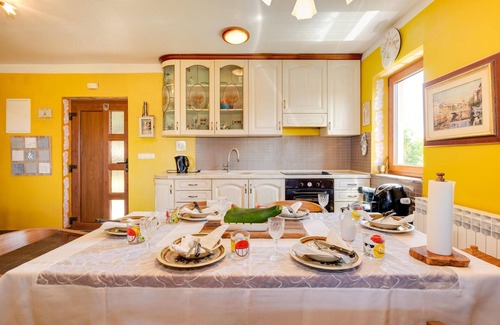 This spacious and traditional holiday home in Gorica Svetojansk impresses with its friendly furnishings and the warm charm of a real country house. The beautiful colours, cosy fireplace and high-quality furnishings create an inviting atmosphere in which you will immediately feel at home.