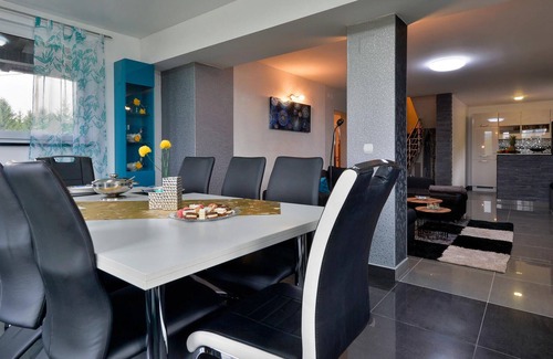Not far from Karlovac, on a small hill and surrounded by beautiful nature, lies this attractive vacation home. At your disposal is a heated pool and next to the pool is a terrace with barbecue. The activity room is located next to the terrace, where you can play table soccer and darts. A multifunctional playground will delight the little ones. In front of the house you can relax under the small gazebo in the hot tub with your favorite book. Karlovac is known as a city on four rivers, where you can walk and enjoy the beautiful nature. We also recommend visiting the capital Zagreb, which is worth seeing and rich in events all year round.