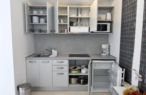 The kitchenette has two electric hobs, a fridge with a freezer compartment (10 l), a toaster, a microwave, a coffee machine with filters, a mocca, a kettle, pots, plates and cutlery, detergent and a sponge.