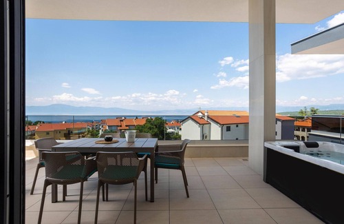 Welcome to the beachfront and comfortable apartment, which welcomes its guests in an extremely attractive panoramic location, just the right place for a nice getaway. Bright rooms and modern furnishings make your stay here a successful experience, but the absolute highlight is the view you will enjoy here while cooking, eating and relaxing together. Look forward to cozy evenings together on the sofa after your adventures. Enjoy wonderful hours outdoors, while extensively sunbathing on the terrace, all thoughts of everyday life are quickly forgotten as you let your eyes wander over the landscape. Refresh yourself in the shared pool and end the day with a soothing bath in the private jacuzzi under the open sky.