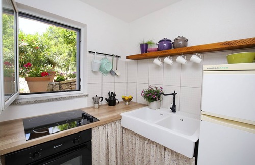 This traditional house offers great stay for 2 persons sleeping in bedroom, additional 2 persons can sleep free of charge on comfortable sofa bed in living room. Kitchen, bathroom, living room and terrace are connected with indoor and ourdoor stairs with bedroom with balcony on uppper floor. Spacius garden with barbecue are on guests disposal. Property is fenced and one pet is allowed. There is a sea view from bedroom and from terrace, beach is practically in front of the house.