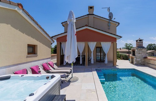 15 km from Pula: Cosy single-family house "Manera". In the hamlet Krvavići 3 km from the centre of Marčana, in a sunny position, 10 km from the sea. Private: property 400 m2 (fenced), small garden with lawn, swimming pool angular, heated (8 x 4 m, depth 140 cm, seasonal availability: 01.Mar. - 01.Dec.) with internal staircase. Outdoor shower, hot tub, terrace (20 m2), barbecue, pool maintenance by the owner/gardener. In the house: internet access. Parking (for 4 cars) at the house on the premises. Shop 3 km, restaurant 3 km, bus stop 3 km, pebble beach 10 km, rocky beach 10 km.