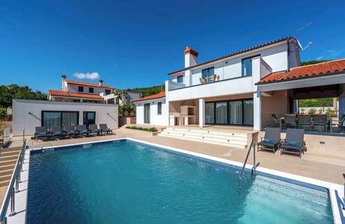 The detached villa is furnished in a modern style. The property is located on the outskirts. Also due to the view over a panorama from the property and its sunny location the domicile is popular. This property is a family-friendly accomodation. Available for your exclusive use: sunbathing lawn, sun lounger, garden shower, barbecue facilities, terrace, garden furniture and courtyard.LocationLabin. The villa is located on a 2500 sqm enclosed garden plot with meadow, bordered by a fence and a wall. The landlord does not live in the house or on the property. Access is via a side road (rubble or gravel, length 20 m). Parking (for 4 cars) is available in a carport and on the property. Specialair conditioning, central heating, electric heating, underfloor heating.Facilities: internet access (WLAN), iron, ironing board and washing machine. TV reception takes place via antenna, satellite.For your safety, the accommodation is equipped with alarm system, smoke detector, fire extinguisher and first aid kid.Hygiene measures: disinfectant and final cleaning with sanitisation. Regional health guidelines are adhered to. PoolAll pools are available for exclusive use. Outdoor pool (usable from early May to end of September, with views of the surroundings, salt water, 5 m x 11 m, depth 1,3 m). Pool towels are available. Dogsallowed, EUR 10.00/pet per day. DistancesShopping 3 km, restaurant 3 km, town center 8 km. For a relaxing holiday, a car is recommended. airport in Pula 35 km. In summer: Adriatic Sea 3 km in Trget (beach 3 km in Trget). DivisionVilla, 2 floors, 5 rooms (including 4 bedrooms), 210 sqm, in total 11 beds (including 3 additional beds). RoomThe entrance to your villa is located on the ground floor, is covered and leads over 1 step directly into the hallway with wardrobe and doors to all rooms.Ground floor: Living room with 3 additional beds on couch/sofa and TV. Bedroom (20 sqm) with 1 double bed (Kingsize), TV and access to the terrace (100 sqm). Bedroom (40 sqm, walk-through room) with 1 double bed (Kingsize), TV and access to the balcony. Kitchen (9 sqm, walk-through room) with TV, dining area (8 seats), electric stove (induction stove, 4 plates), oven, extractor hood, dishwasher, fridge (150 l, icebox), microwave, coffee machine, toaster, electric kettle, washing machine and access to the terrace. Bathroom (6 sqm) with washing machine, shower, 1 washbasin, WC, hairdryer and window. Separate toilet (3 sqm) with 1 washbasin and WC. 1st floor: Bedroom (20 sqm) with 1 double bed (Kingsize), TV and access to the balcony. Bedroom (25 sqm) with 1 double bed (Kingsize), TV and access to the balcony. Bathroom (6 sqm) with washing machine, shower, 1 washbasin, WC, hairdryer and window. Bathroom (6 sqm) with washing machine, shower, 1 washbasin, WC, bidet, hairdryer and window. with (100 sqm). with (20 sqm). Terms of lease and pricesIncluded in the priceOutdoor pool, internet access, air conditioning, parking place, electricity, gas, water, final cleaning, bed linen, hand towels, Wireless Internet access. Side costs-Additionally(Payable when booking)/local tax.Deposit:EUR 400,-/object.