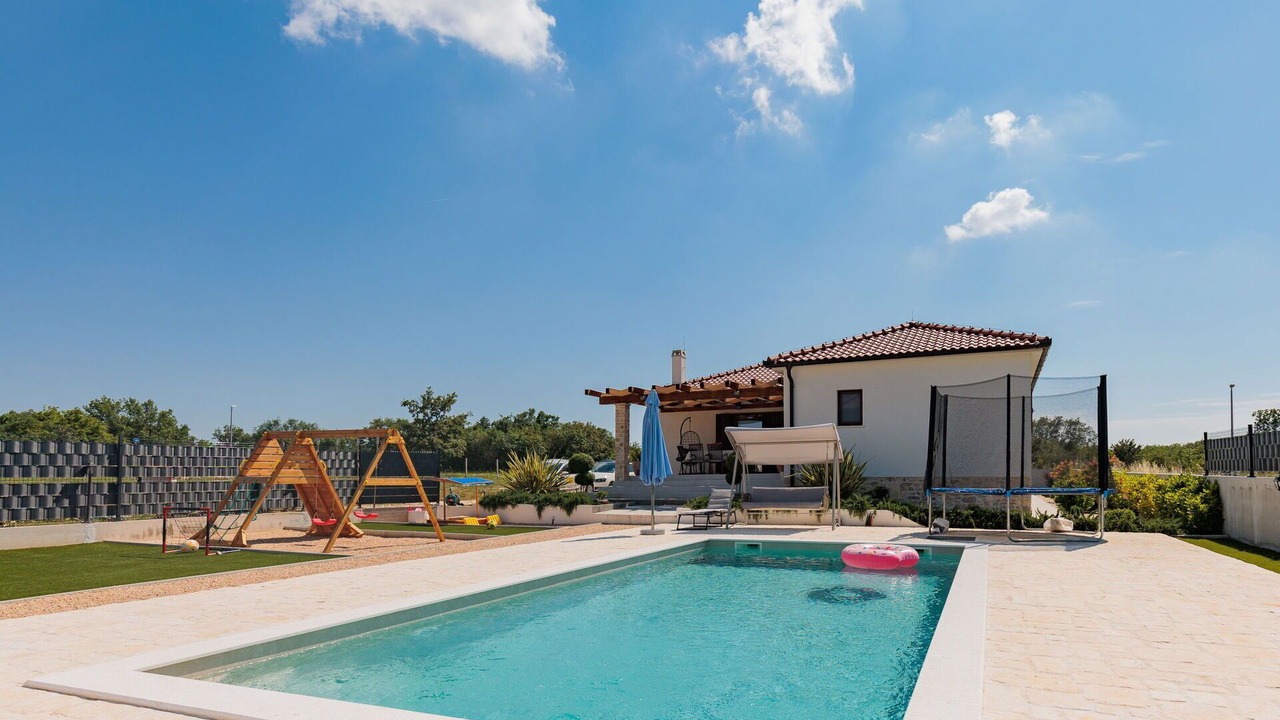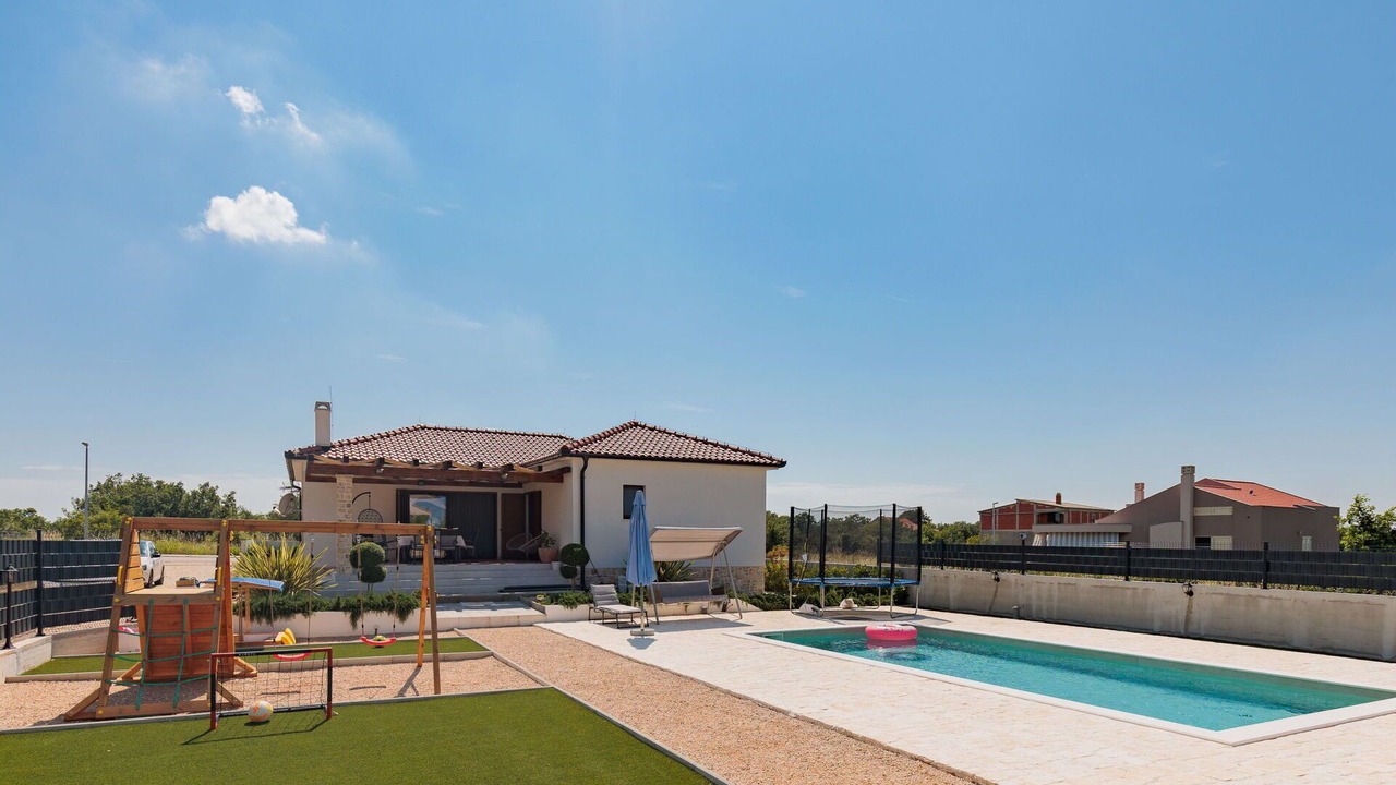 Discover a beautiful, cosy single-family house called "KLM", built in 2023, nestled in the hamlet of Rupalj, just 3.2 km from the centre of Poličnik and 7.3 km from the centre of Posedarje. This vacation rental boasts a sunny position, only 7 km from the sea, and offers a fenced private property spanning 1'000 m2 with a wildlife garden, a seasonal swimming pool, and ample parking for 3 cars on the premises. Enjoy modern amenities like Internet WiFi, a trampoline, and a washing machine within the house.