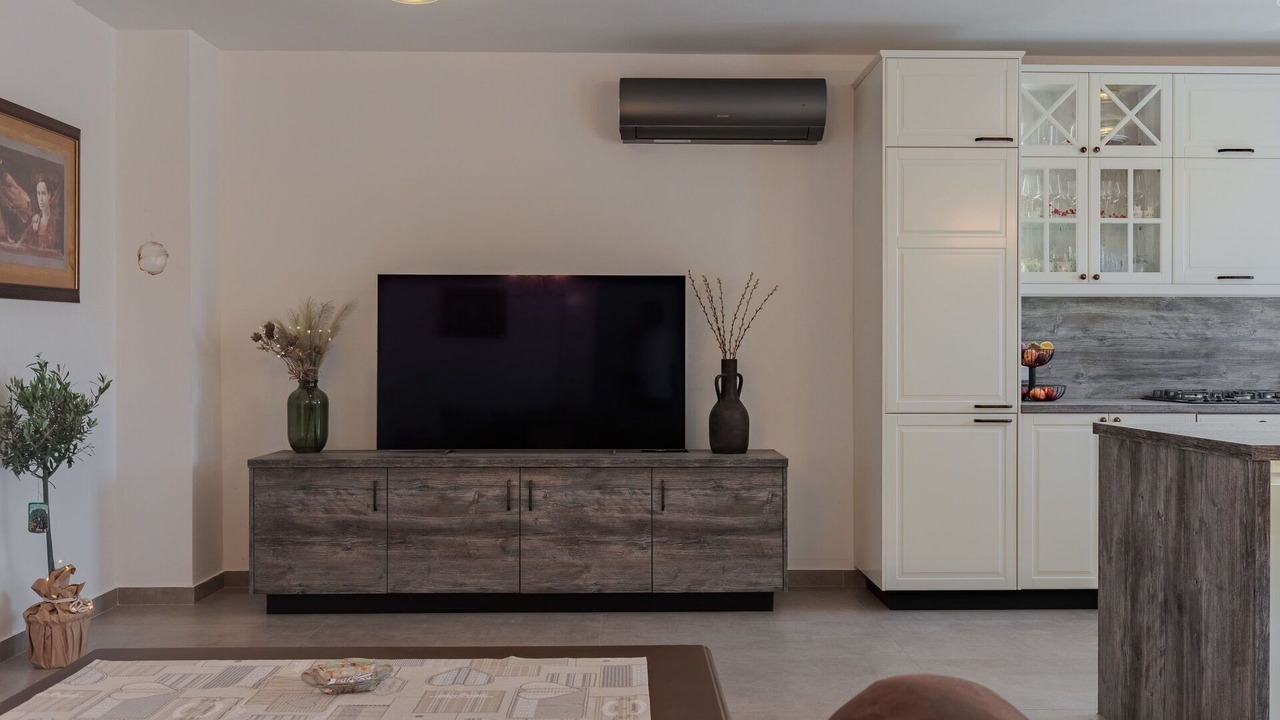 The open kitchen is well-equipped with an oven, dishwasher, four gas rings, toaster, kettle, freezer, and an electric coffee machine, making meal preparation a breeze during your vacation. Additional amenities include a baby cot, hair dryer, and complimentary WiFi internet access. The property also features air conditioning throughout, ensuring your comfort during your stay.